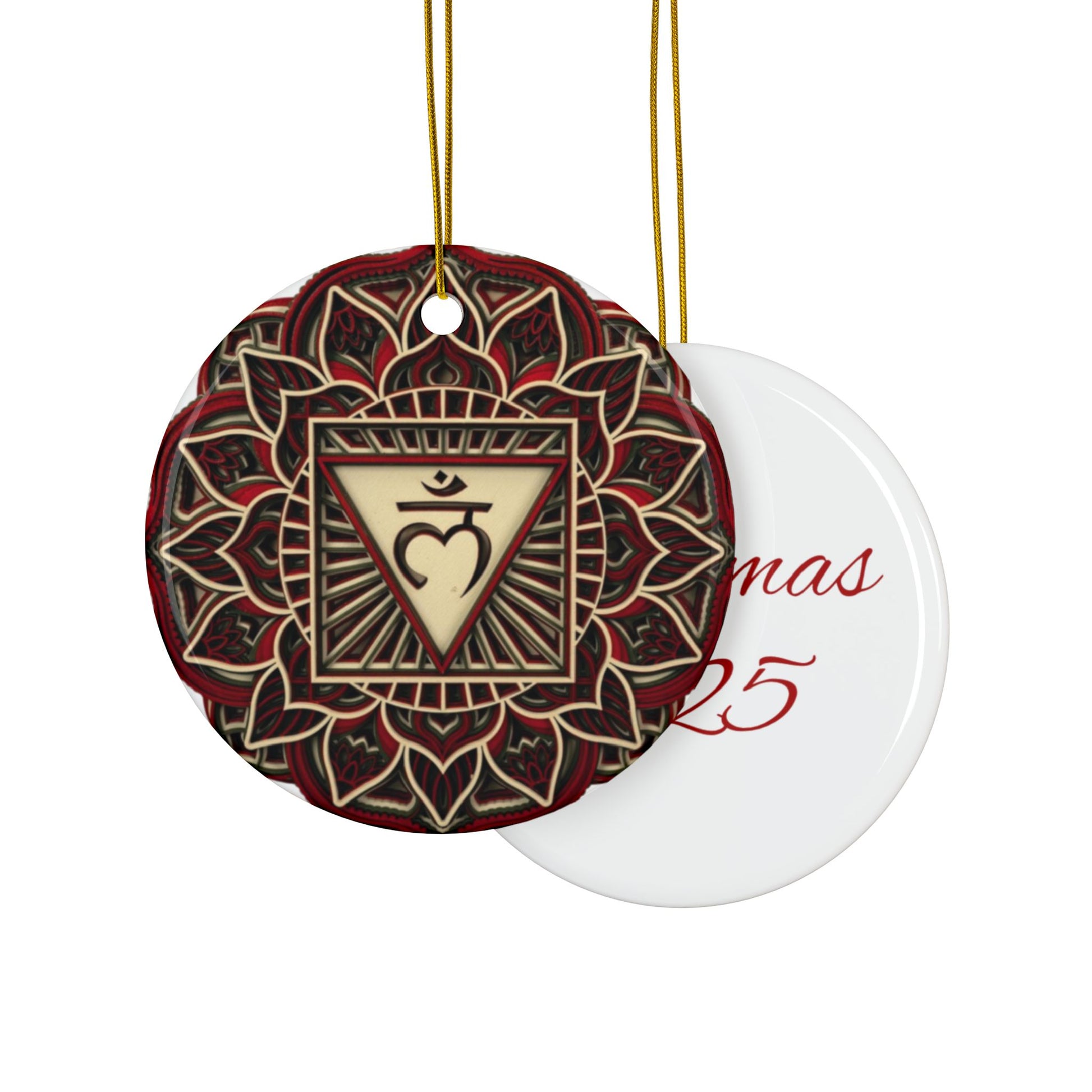 Root Chakra Mandala Ceramic Ornament is a vibrant and durable decorative piece with a glossy finish. It includes a gold string for hanging and features different designs on the front and back. Perfect for those interested in chakras and spiritual healing, this ornament is ideal for decorating during holidays, yoga events, and meditation spaces.