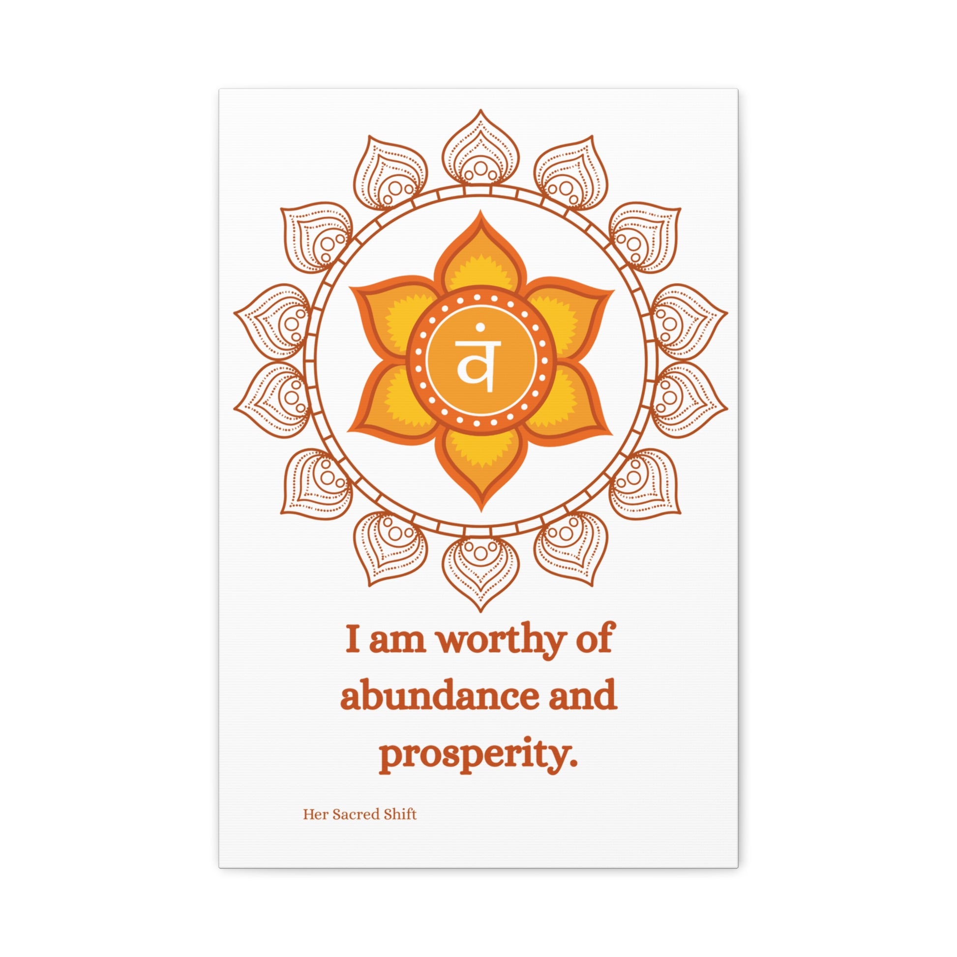 This Sacral Chakra wall art celebrates the energy of abundance and emotional freedom. With a glowing orange mandala surrounding the Swadhisthana symbol and the powerful affirmation “I am worthy of abundance and prosperity,” this piece invites you to welcome wealth in all its forms — love, joy, intimacy, and flow.