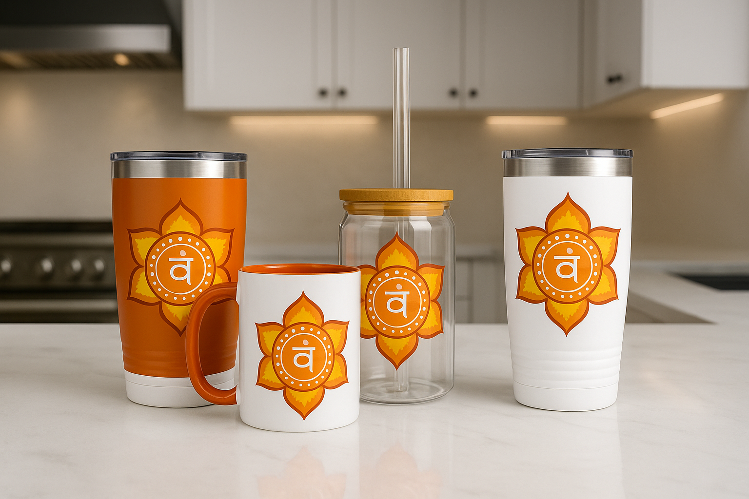 Each piece is adorned with the Sacral Chakra symbol — a gentle reminder to embrace joy, sensuality, and creative freedom. Whether you’re journaling, meditating, or simply enjoying your favorite drink, this set invites you to reconnect with your divine flow and emotional harmony.