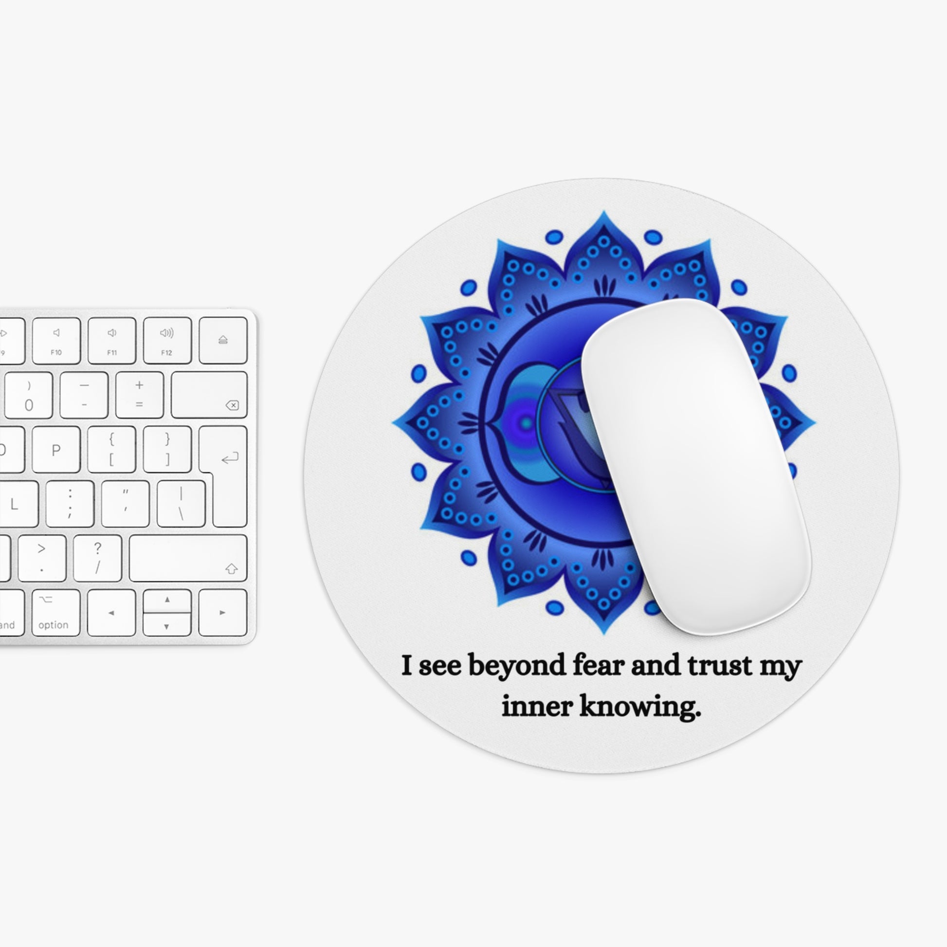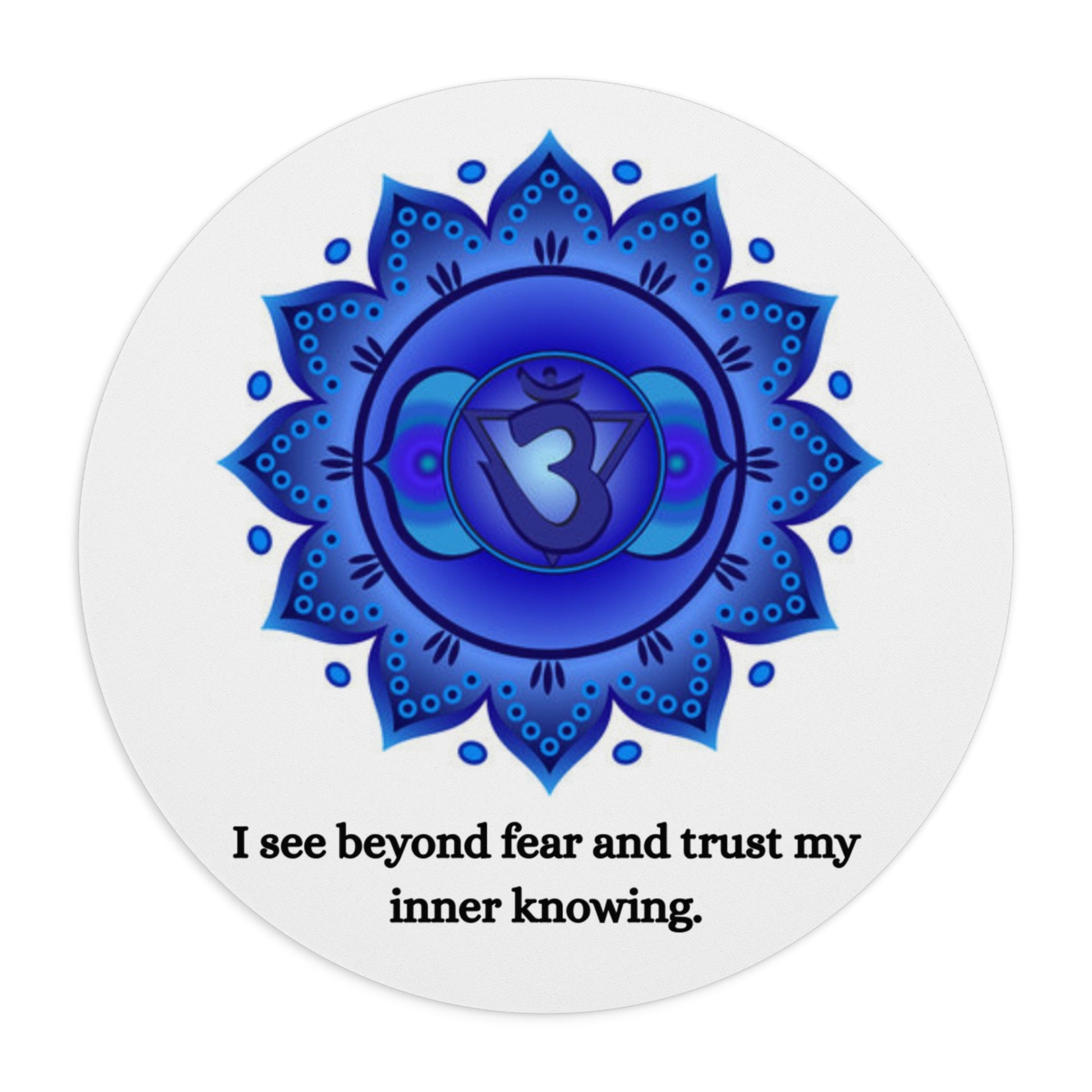 Strengthen your intuition every time you sit at your desk. This Third Eye Chakra mouse pad features the Ajna lotus symbol in rich, luminous blues, paired with the affirmation: “I see beyond fear and trust my inner knowing.”